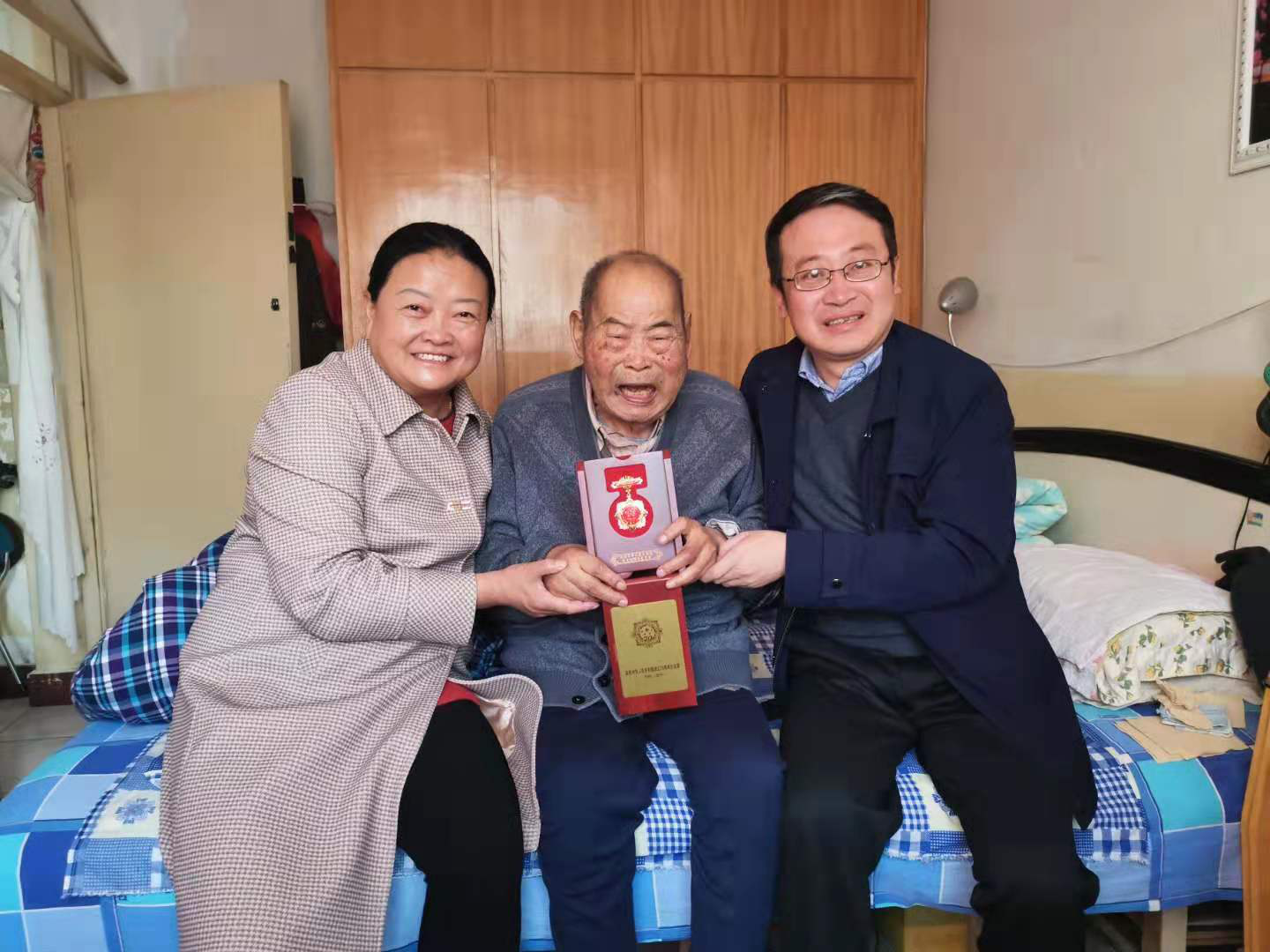 为隆重庆祝中华人民共和国成立70周年,根据《关于认真做好“庆祝中华人民共和国成立70周年”纪念章发放工作的通知》州人社字【2019】410文件精神和州卫生健康委党委要求,9月27日上午,甘南州卫生公司党总支书记、董事长赵苏静同志、甘南州卫生公司党总支副书记、副董事长黎昱民同志一行4人,赴公司离休老干部陈衍耐家中送去中共中央、 国务院 、中央军委颁发的“庆祝中华人民共和国成立70周年”纪念章及慰问品。赵苏静同志转达了上级部门的亲切关怀,向子女询问陈老的身体状况、日常起居和陈老进行了愉快的交流,收到纪念章的时候陈老十分开心,老人连连道谢,感谢党和政府还惦记着自己。