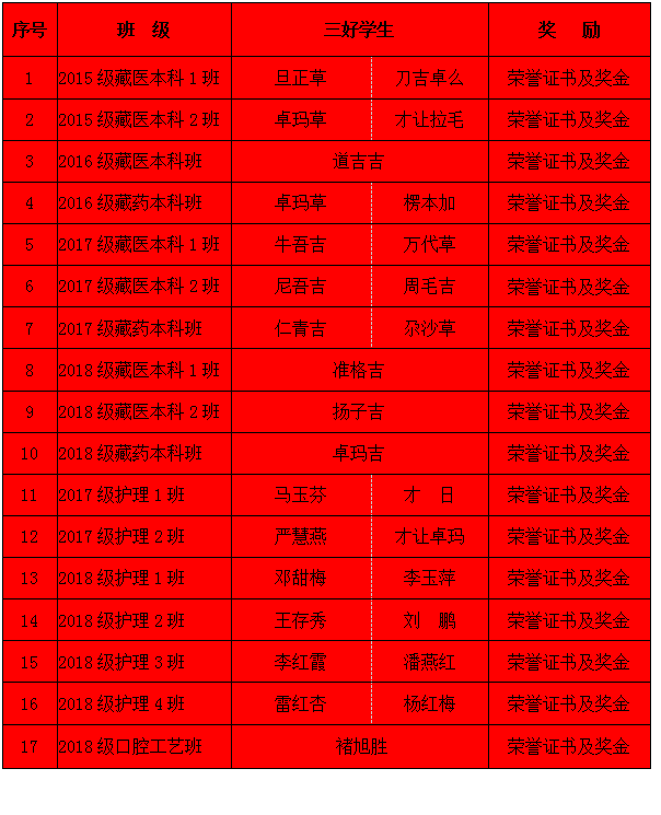 大会表彰了才波草等16名优秀员工干部、旦正草等29名三好员工和4个先进班集体。此次评优选先活动,充分体现了“公开、公正、公平”的原则,所评选出的三好员工、优秀员工干部和先进班集体,集中体现了公司(院)员工积极、健康、向上的精神风貌,是全校(院)员工和班集体的优秀代表和榜样。